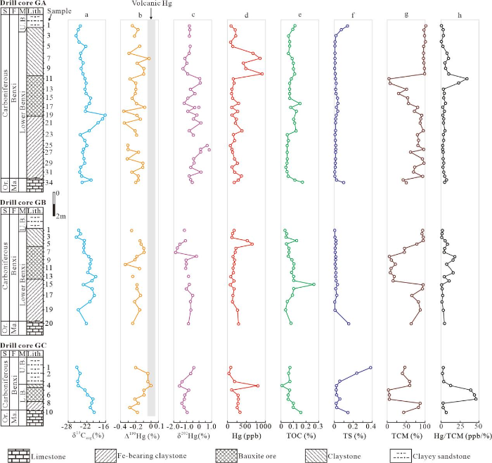2. 华北盆地三个钻孔岩心中铝土矿和粘土岩中Hg主要被粘土矿物吸附。含矿岩系上部粘土岩中明显的Hg富集和相对应接近零值的Δ199Hg表明晚石炭世末期华北北缘发生了大规模的火山活动;该期火山作用改变了整个华北地区的地表环境条件,加速了长期风化的富铝残留物,导致大规模铝土矿在岩溶喀斯特面上快速形成。