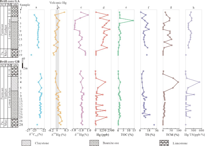 3. 右江盆地两个钻孔岩心中铝土矿和粘土岩中Hg主要赋存在黄铁矿中。整个铝土矿层和粘土岩层中强烈的Hg富集和一致近零的Δ199Hg,证实火山活动参与了铝土矿成矿过程;峨眉山大火成岩省和同期岛弧系统相关的火山活动导致右江盆地的短期风化和快速铝土矿化。