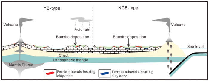 全球铝土矿主要包括红土型和喀斯特型两种类型。红土型铝土矿是铝硅酸盐岩原地风化作用的产物,具有成熟的成矿模型;而喀斯特型铝土矿具有异地多来源特征,成矿过程异常复杂。中国铝土矿以喀斯特型为主,主要分布在华北和右江盆地。华北克拉通晚石炭世<20 Ma(320-300 Ma)形成大于50亿吨铝土矿,右江盆地晚二叠世<10 Ma(260-250 Ma)形成大于10亿吨铝土矿;二者均具有短期大规模成矿特征。但是导致如此大规模喀斯特型铝土矿短期内快速形成的因素尚不清晰,铝土矿表生富集机制仍然存在争论。为了进一步查清大规模喀斯特型铝土矿快速形成机制,我校邓军教授团队刘学飞教授、王庆飞教授与南京大学国际同位素效应研究中心彭永波研究员及贵阳地球化学研究所尹润生研究员合作,对华北和右江盆地典型铝土矿床开展翔实的地质学,详细的矿物学、Hg含量和同位素组成等分析,阐明了广泛的火山活动与古喀斯特面上短期大规模铝土矿形成的关系,取得了以下重要成果: