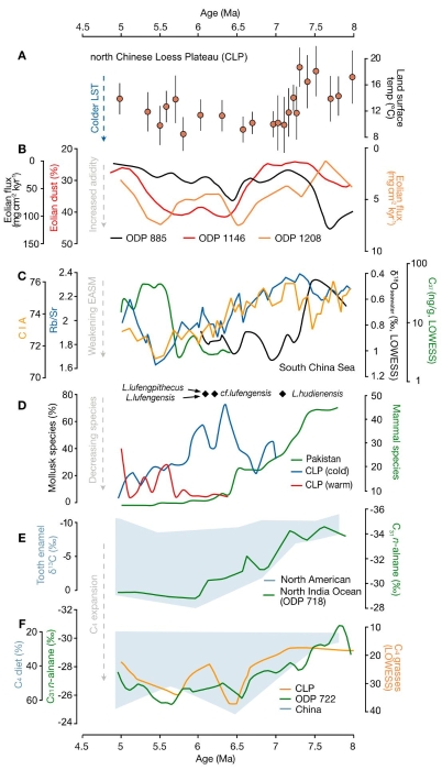 晚中新世末期-早上新世(8-5 Ma),陆地生态环境经历剧变,主要表现为:1)全球荒漠化加剧;2)C4草本植被(使用C4光合途径)经历由低纬向中高纬的扩张,原本温室环境下的森林被灌木与草地取代;3)北半球瞬时冰川开始出现;4)陆生动物群落结构与食性经历重大转变,灵长目类人猿在~7 Ma开始直立行走。在陆地生态环境经历剧变的同时,全球海洋表面温度在7.5-5.4 Ma之间经历了显著的同步降温(中高纬地区达到6-8 ℃);在降温峰值期(7-5.5 Ma), 中-高纬地区的海表温度骤降至与现今相近的水平;这颠覆了前人对晚中新世平稳气候状态的认知。这一系列气候与生态环境变革推动了现今地球生态格局的形成。前人指出大气CO2浓度变化可能驱动了晚中新世全球陆地-海洋温度演化,进而引发全球生态环境变革。然而到目前为止,我们对该时期的陆地温度响应了解较少。