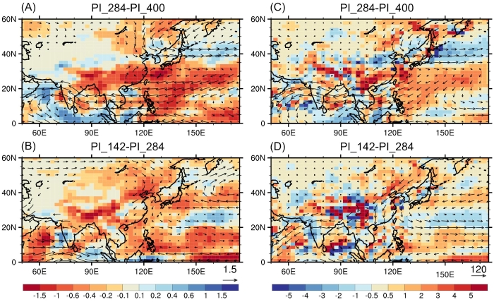 图4 东亚地区夏季降水与大气环流演化对大气CO2浓度变化的响应