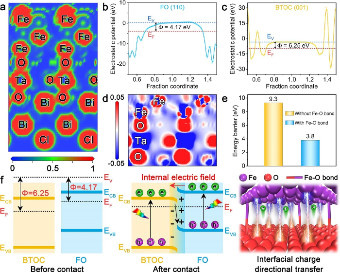 3. α-Fe2O3与Bi4MO8Cl异质界面的功函数差所诱导的内电场为组分间光生电荷的矢量迁移提供了强大的驱动力。同时,界面Fe-O键不仅可以作为原子级电荷传输通道,还降低了界面电荷转移能垒(ca. ~5.5 eV),因此显著加速了Z型电荷转移,实现了有效的空间电荷分离。