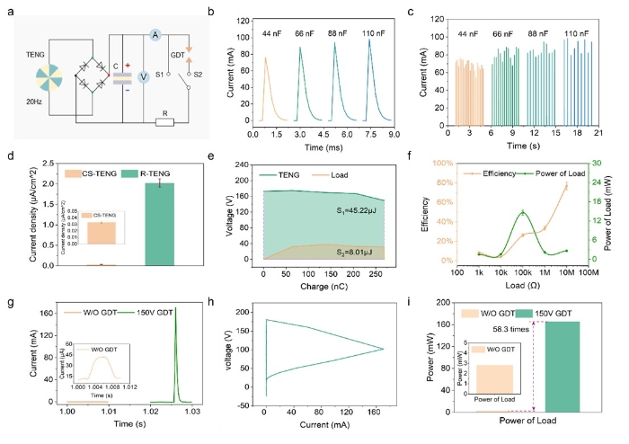针对以上问题,我校工程技术学院硕士研究生李博在导师杨义勇教授指导下,联合外校季林红教授和程嘉副研究员等人,提出了一种以气体放电管(GDT)作为快速开关的峰值增益技术,可显著提升TENG瞬时输出电流与负载峰值功率,同时验证了TENG输出与负载消耗之间存在较大差距,将能量利用率的概念引入TENG领域。主要研究结果如下: