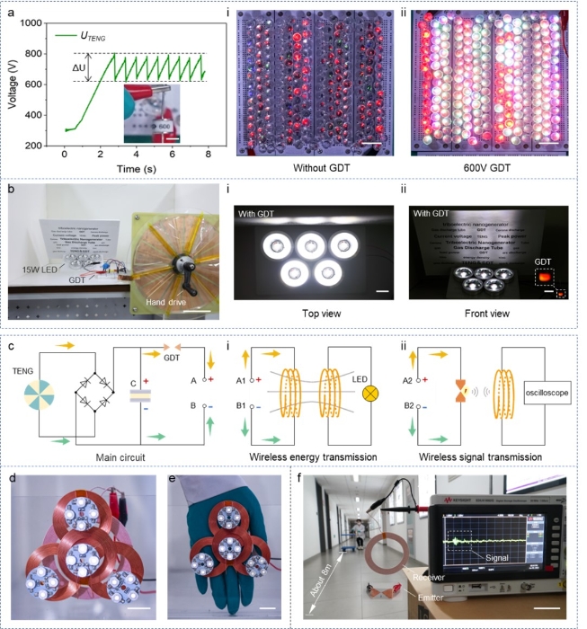 1. 将气体放电管(GDT)作为毫秒级的快速开关,在5 Ω的低电阻下将峰值电流提高4000倍,峰值负载功率达165.5 mW(图1和图2)。另外,利用TENG-GDT系统的高峰值功率,显著提高了15 W灯组和208个直径为10 mm的LED的亮度。此外,在人体组织的屏障下,仍可以无线点亮一个16 W的灯组(图3)。