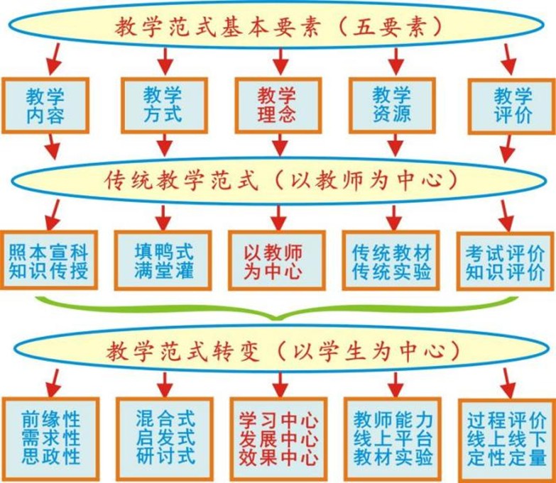 (2)教学内容:于信息化时代知识获取便利、不受时空限制的特点,因此,课堂内容的更新、转变显得尤为重要。传统的教学内容突出知识传授,表现形式为照本宣科,教学范式转变下教学内容突出“知识”向“问题导向”转变、“知识”向“能力和素养”转变。因此,课程教学内容转变突出“课程内容与课程模块体系化、与颠覆性前沿技术、与学科发展前沿、与科学研究、与课程实践平台有机融合、与课程思政元素”六大内容有机融教。