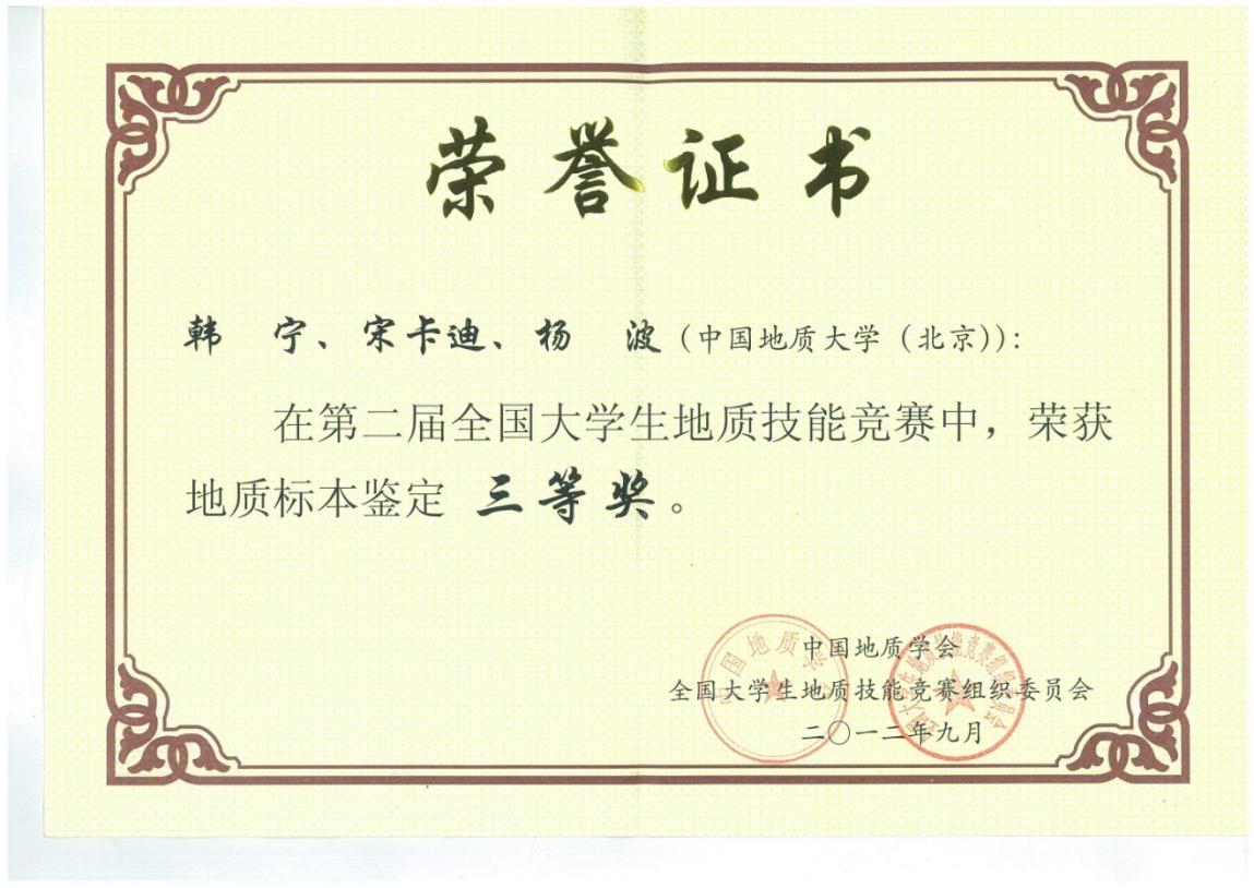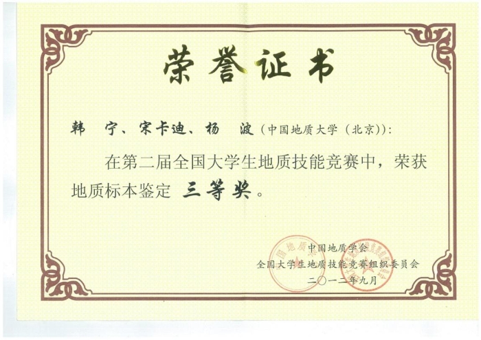 2012 韩宁,宋卡迪,杨波 第二届全国大学生地质技能竞赛 地质标本鉴定三等奖