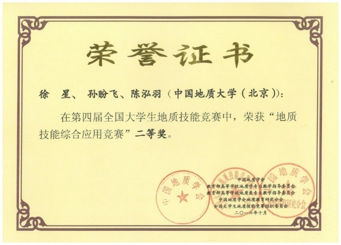 2016 徐星,孙盼飞,陈泓羽 第四届全国大学生地质技能竞赛 地质技能综合应用二等奖