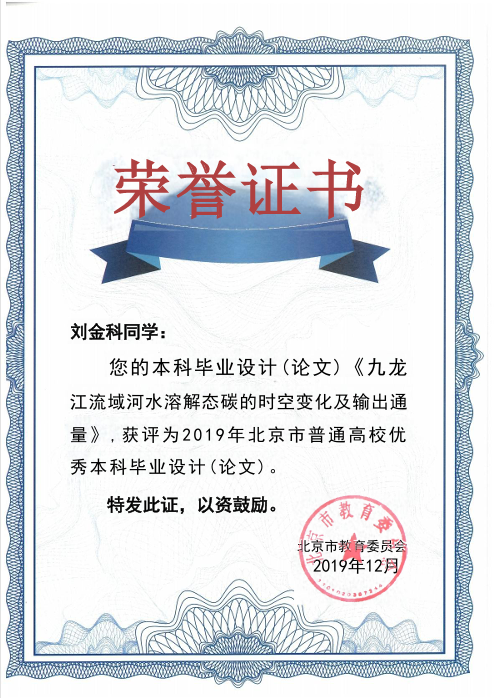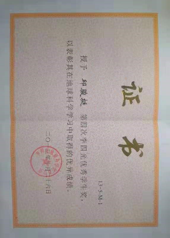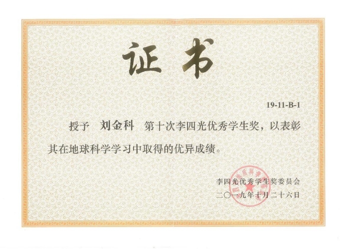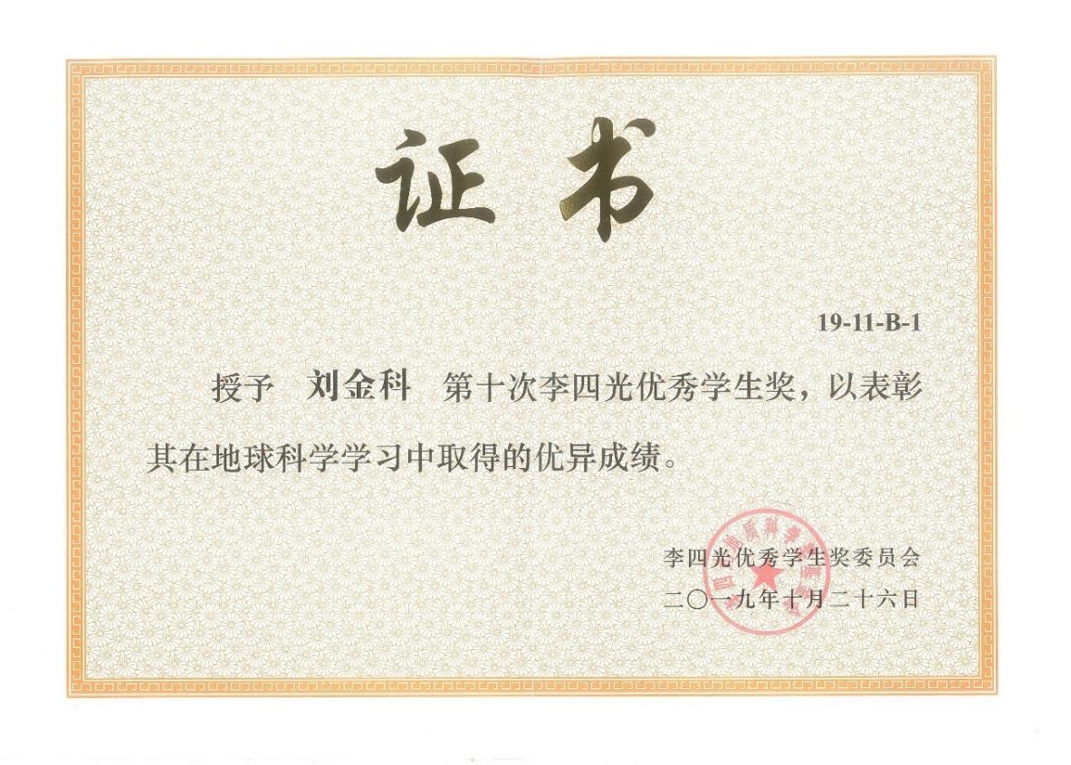 2019 李四光优秀学生奖-刘金科 国家级 李四光优秀学生奖委员会