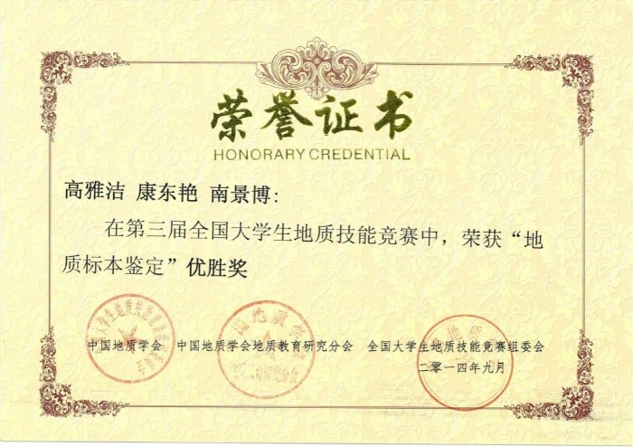 2014 高雅洁,康东艳,南景博 第三届全国大学生地质技能竞赛 地质标本鉴定优胜奖