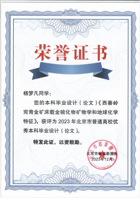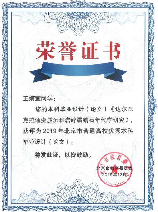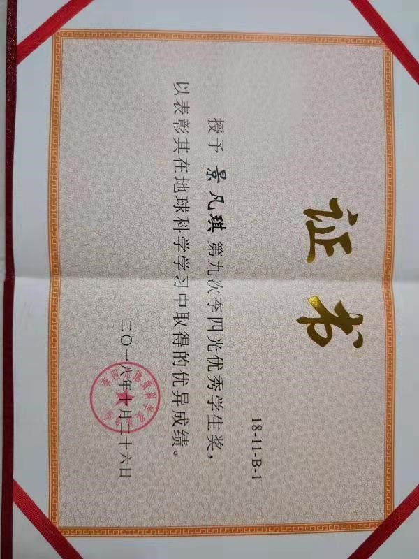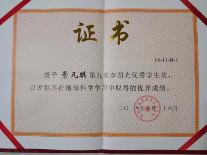 2018 李四光优秀学生奖-景凡琪 国家级 李四光优秀学生奖委员会