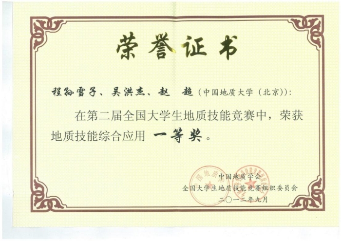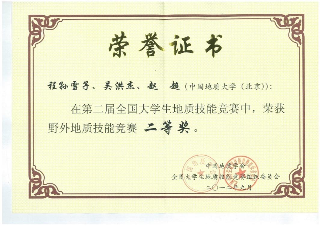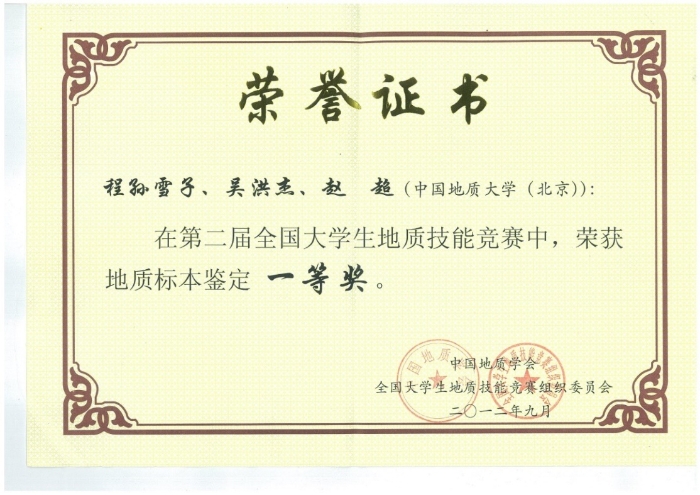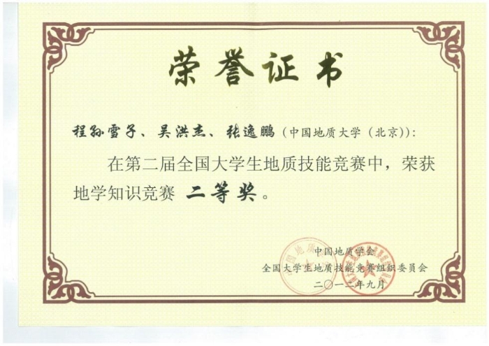 2012 程孙雪子,吴洪杰,赵超 第二届全国大学生地质技能竞赛 地学知识竞赛二等奖