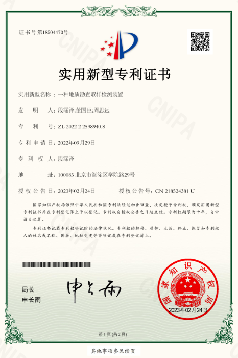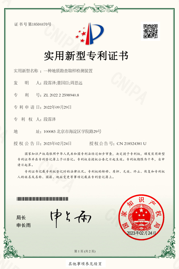 .2023 段霈泽 董国臣 周思远 实用新型专利:一种地质勘查取样检测装置