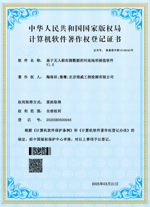 1.2025 陶雨田 詹骞;北京瑞威工程检测有限公司 软件著作权:基于无人船实测数据的河底地形插值软件 V1.0