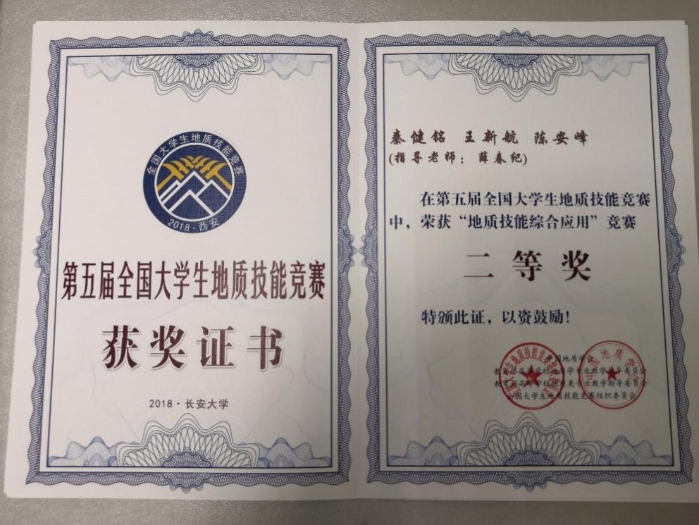 2018 秦健铭,王新航,陈安峰 第五届全国大学生地质技能竞赛 地学技能综合应用二等奖