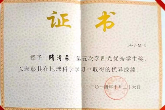 2014 李四光优秀学生奖-隋清霖 国家级 李四光优秀学生奖委员会