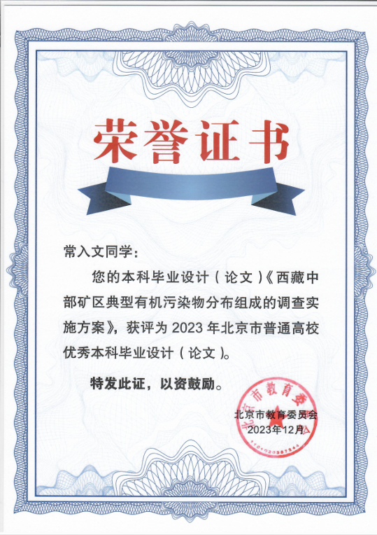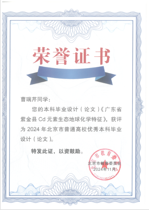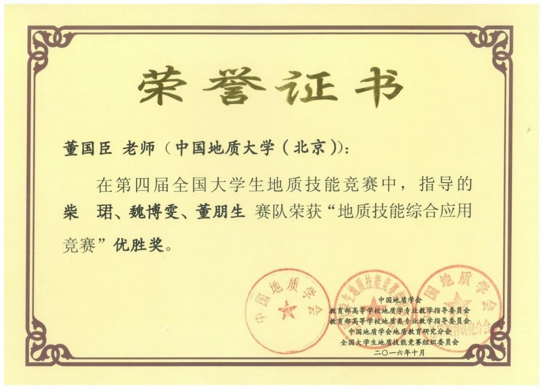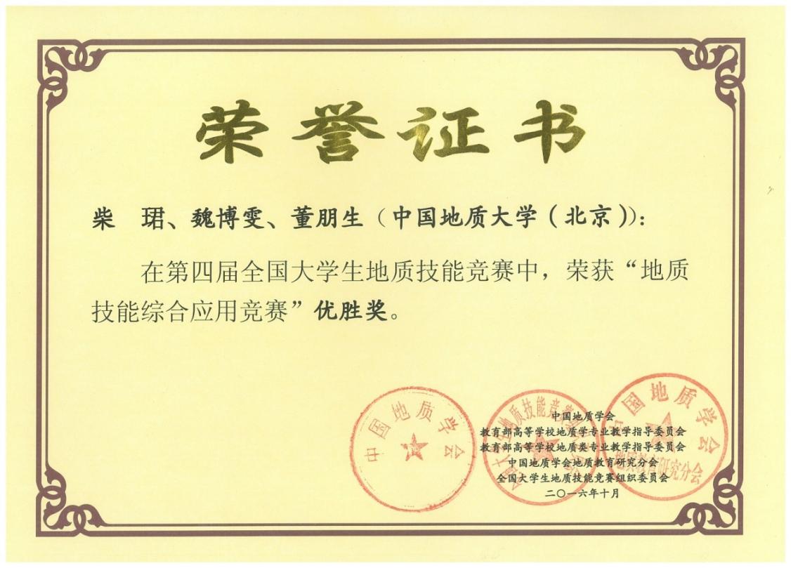 2016 柴珺,魏博雯,董鹏生 第四届全国大学生地质技能竞赛 地质技能综合应用竞赛优胜奖