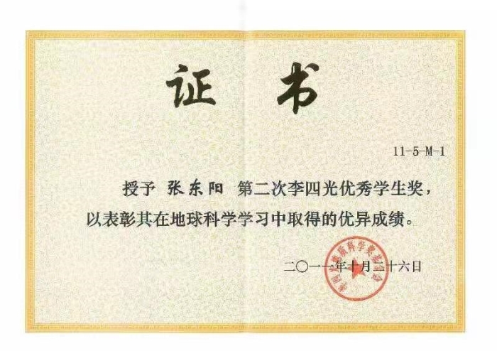 2011 李四光优秀学生奖-张东阳 国家级 李四光优秀学生奖委员会
