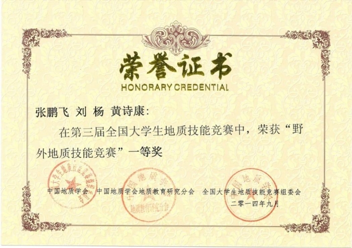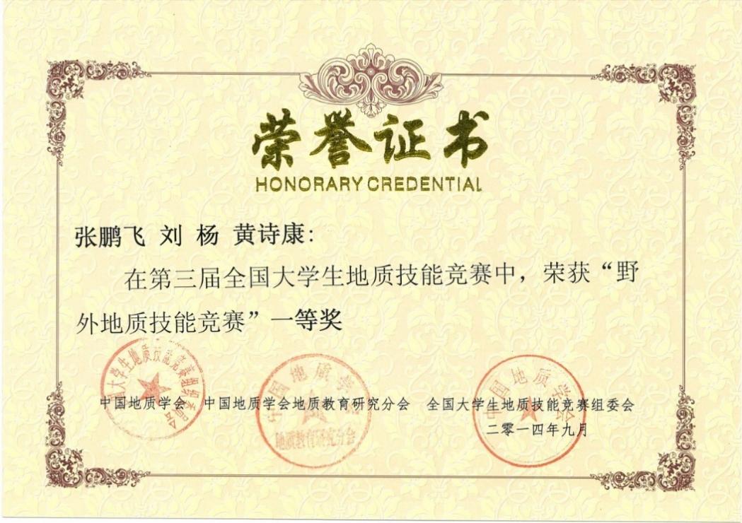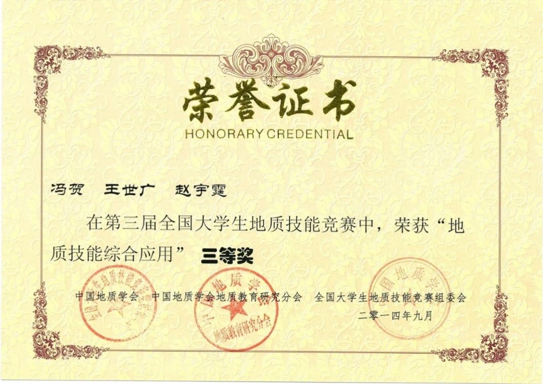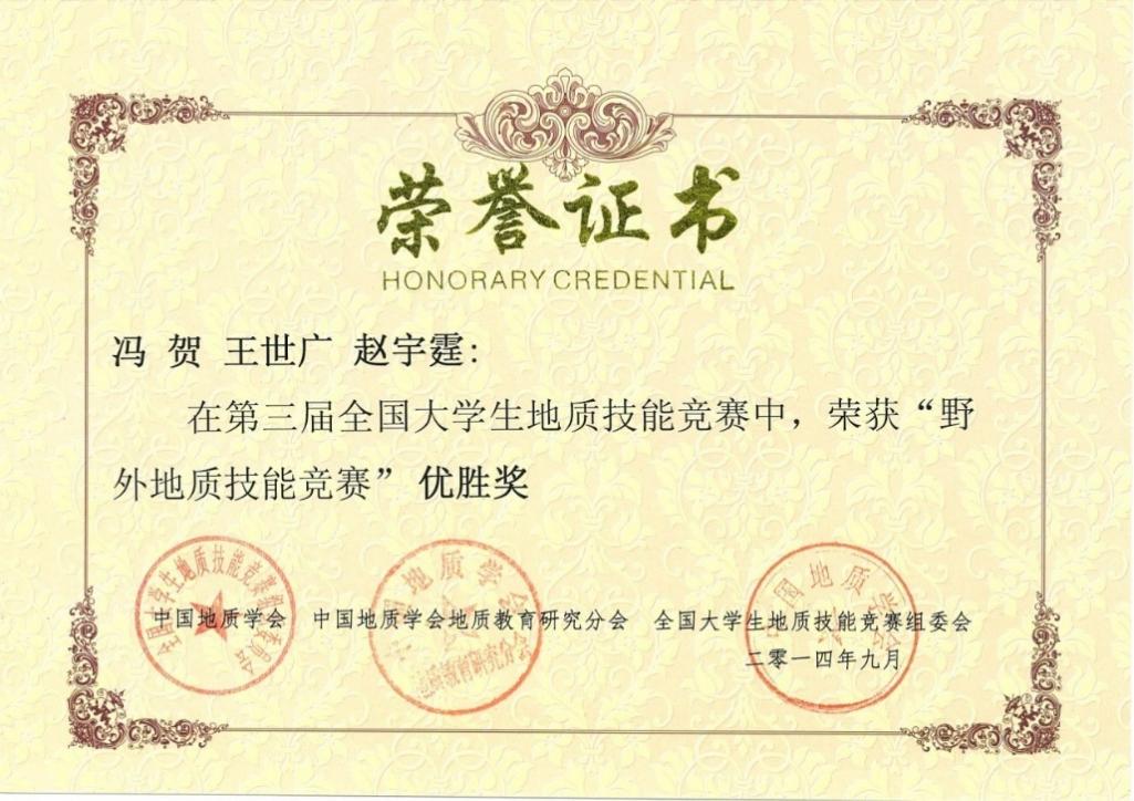 2014 冯贺,王世广,赵宇霆 第三届全国大学生地质技能竞赛 野外地质技能竞赛优胜奖