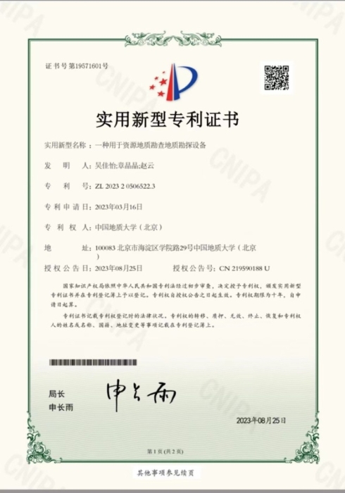 4.2023吴佳怡 章晶晶 赵云 实用新型专利:一种用于资源地质勘察地质勘探设备