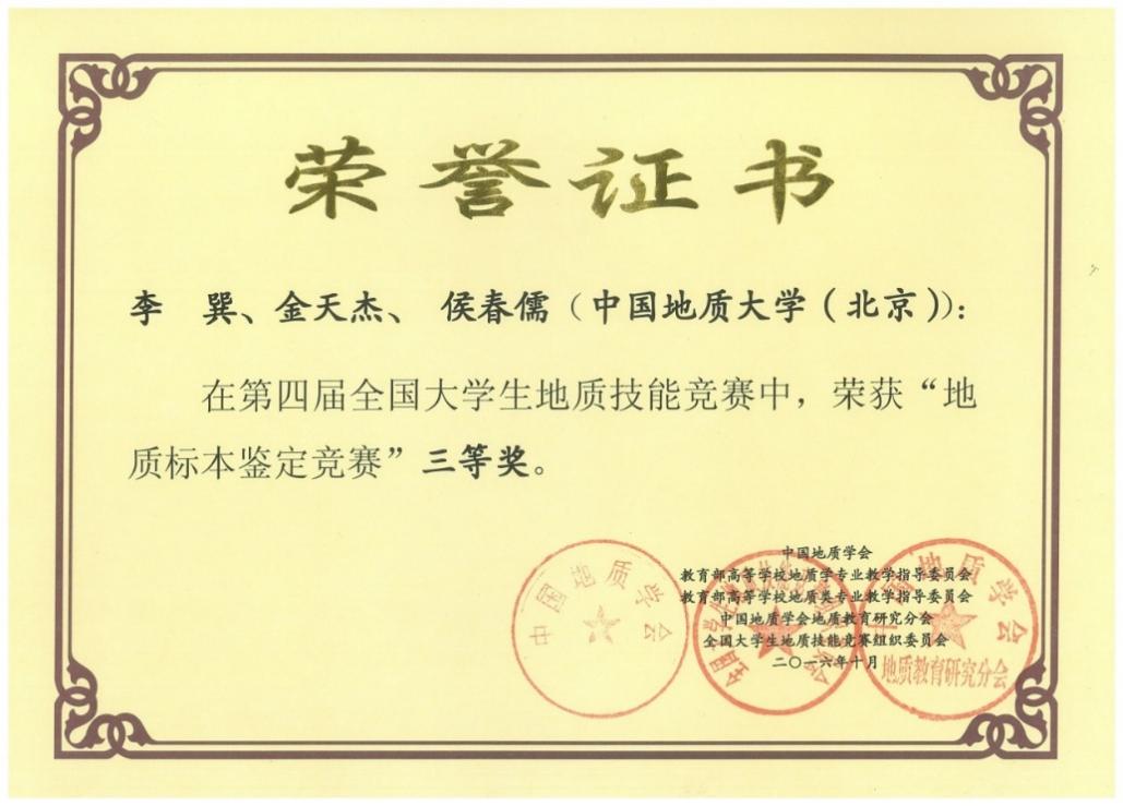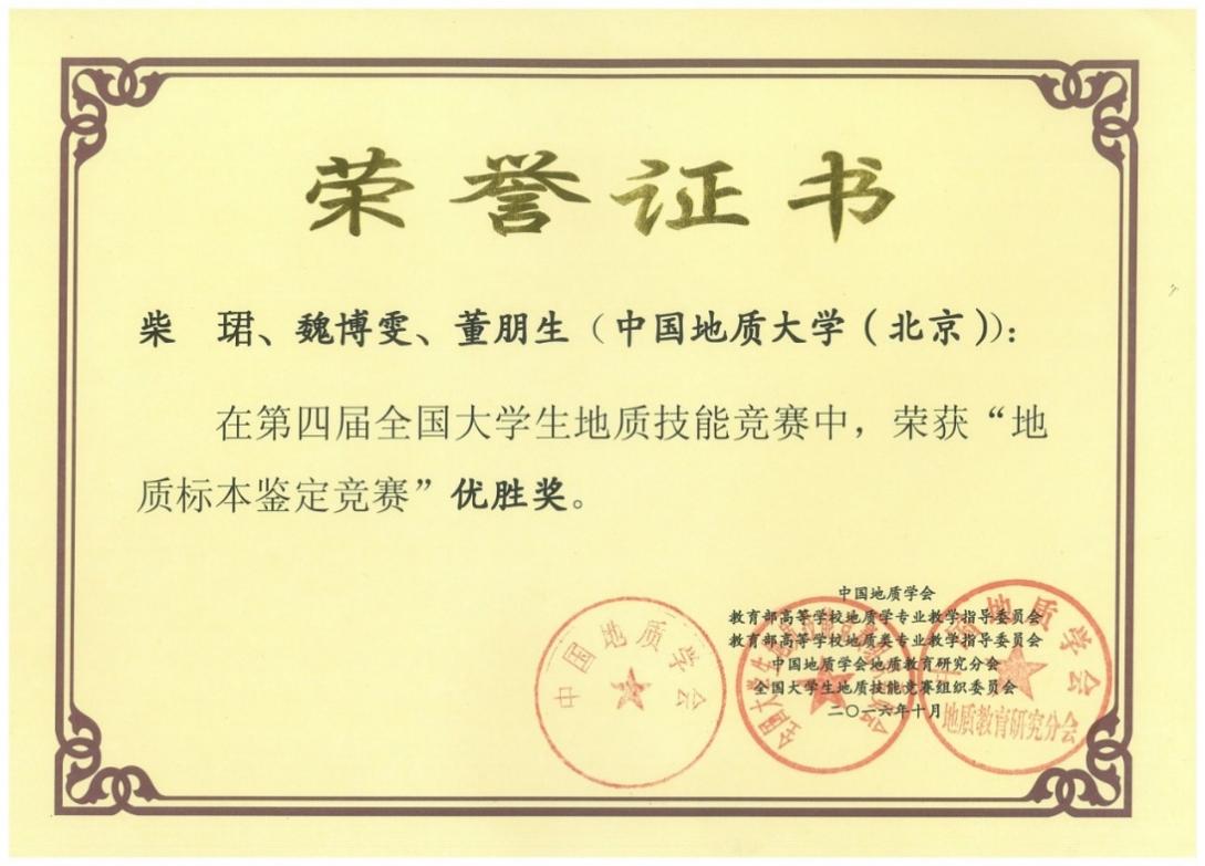 2016 柴珺,魏博雯,董鹏生 第四届全国大学生地质技能竞赛 地质标本鉴定竞赛优胜奖