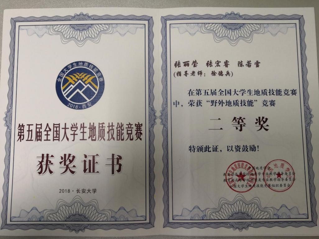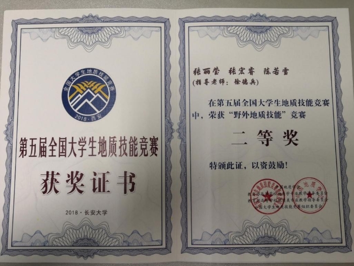 2018 张丽莹,张宏睿,陈若雪 第五届全国大学生地质技能竞赛 野外地质技能竞赛二等奖