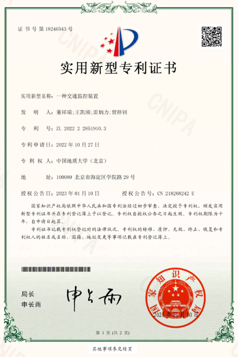 .2023 董祥瑞 王凯颀 雷炳力 贾梓钊 实用新型专利:一种交通监控装置