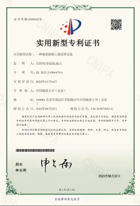 13.2023吴佳怡 章晶晶 赵云 实用新型专利:一种地质勘探土壤采样设备