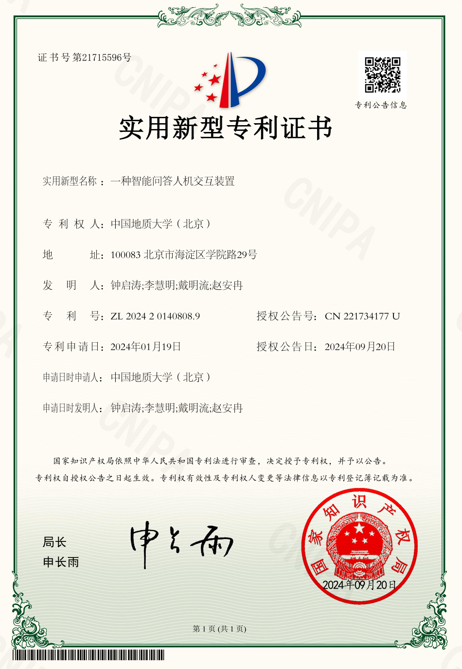 15.2024 钟启涛 李慧明 戴明流 赵安冉 实用新型专利:一种智能问答人机交互装置