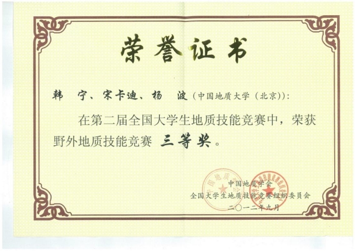 2012 韩宁,宋卡迪,杨波 第二届全国大学生地质技能竞赛 野外地质技能竞赛三等奖