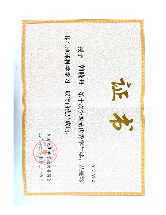 2019 李四光优秀学生奖-韩晓丹 国家级 李四光优秀学生奖委员会