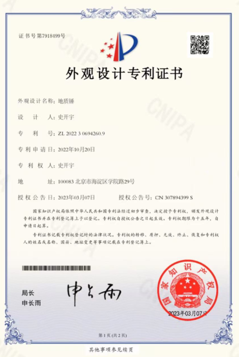 .2022 蔡哲鑫 张世权 陶羽田 实用新型专利:一种便携式野外岩石样品采集器