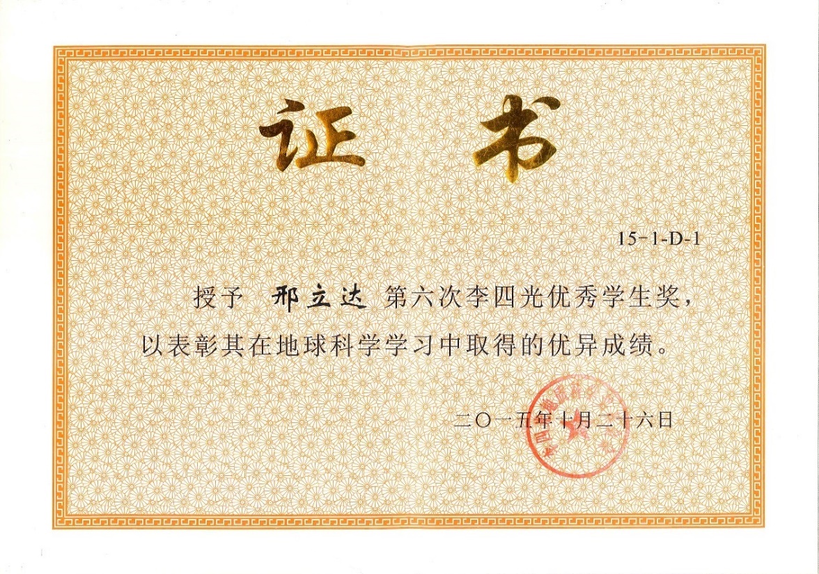 2015 李四光优秀学生奖-邢立达 国家级 李四光优秀学生奖委员会