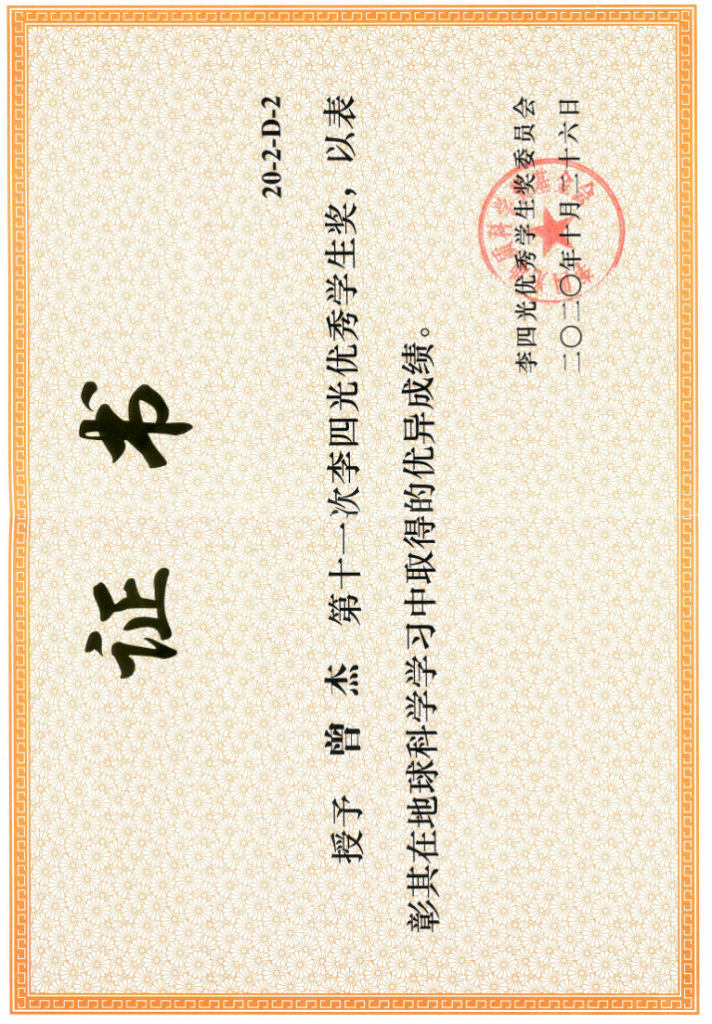 2020 李四光优秀学生奖-曾杰 国家级 李四光优秀学生奖委员会