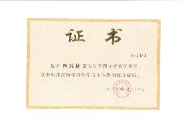 2016 李四光优秀学生奖-阳琼艳 国家级 李四光优秀学生奖委员会