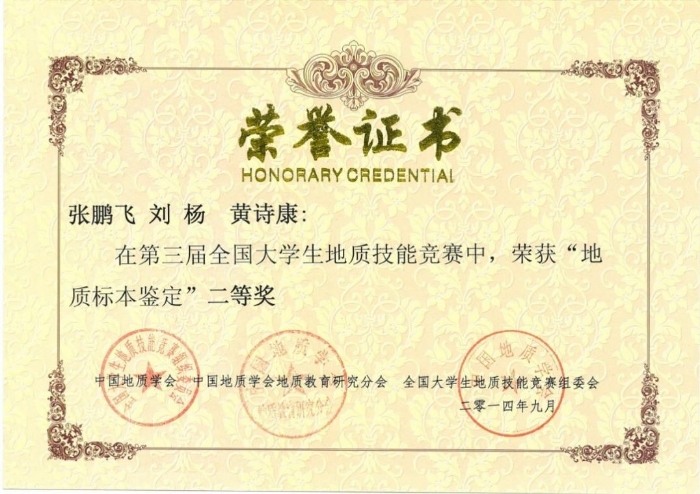 2014 张鹏飞,刘杨,黄诗康 第三届全国大学生地质技能竞赛 地质标本鉴定二等奖