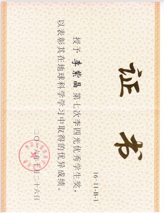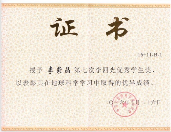 2016 李四光优秀学生奖-李紫晶 国家级 李四光优秀学生奖委员会