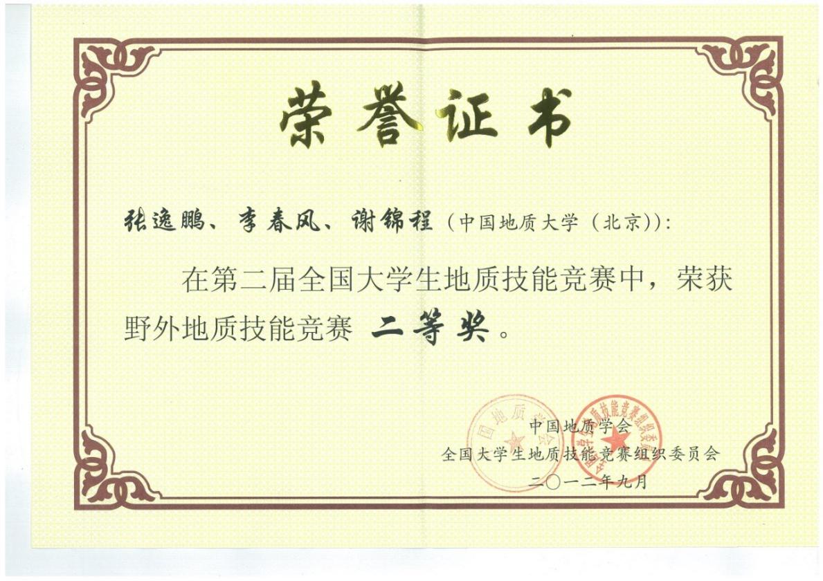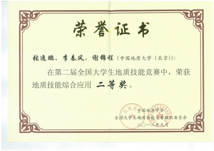 2012 张逸鹏,李春风,谢锦程 第二届全国大学生地质技能竞赛 地质技能综合应用二等奖