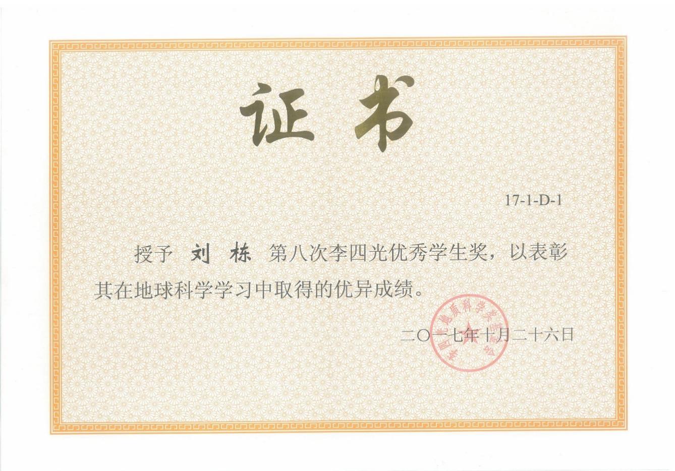 2017 李四光优秀学生奖-刘栋 国家级 李四光优秀学生奖委员会