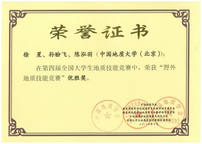 2016 徐星,孙盼飞,陈泓羽 第四届全国大学生地质技能竞赛 野外地质技能竞赛优胜奖