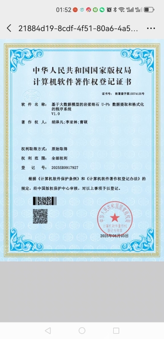 18. 2025 胡泽凡,李亚林,曹硕,软件著作权:基于大数据模型的岩浆锆石 U-Pb 数据提取和格式化的程序系统y1.0