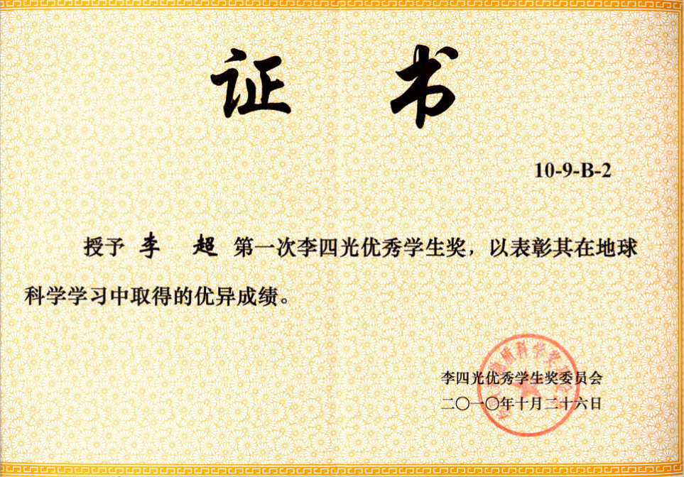 2010 李四光优秀学生奖-李超 国家级 李四光优秀学生奖委员会
