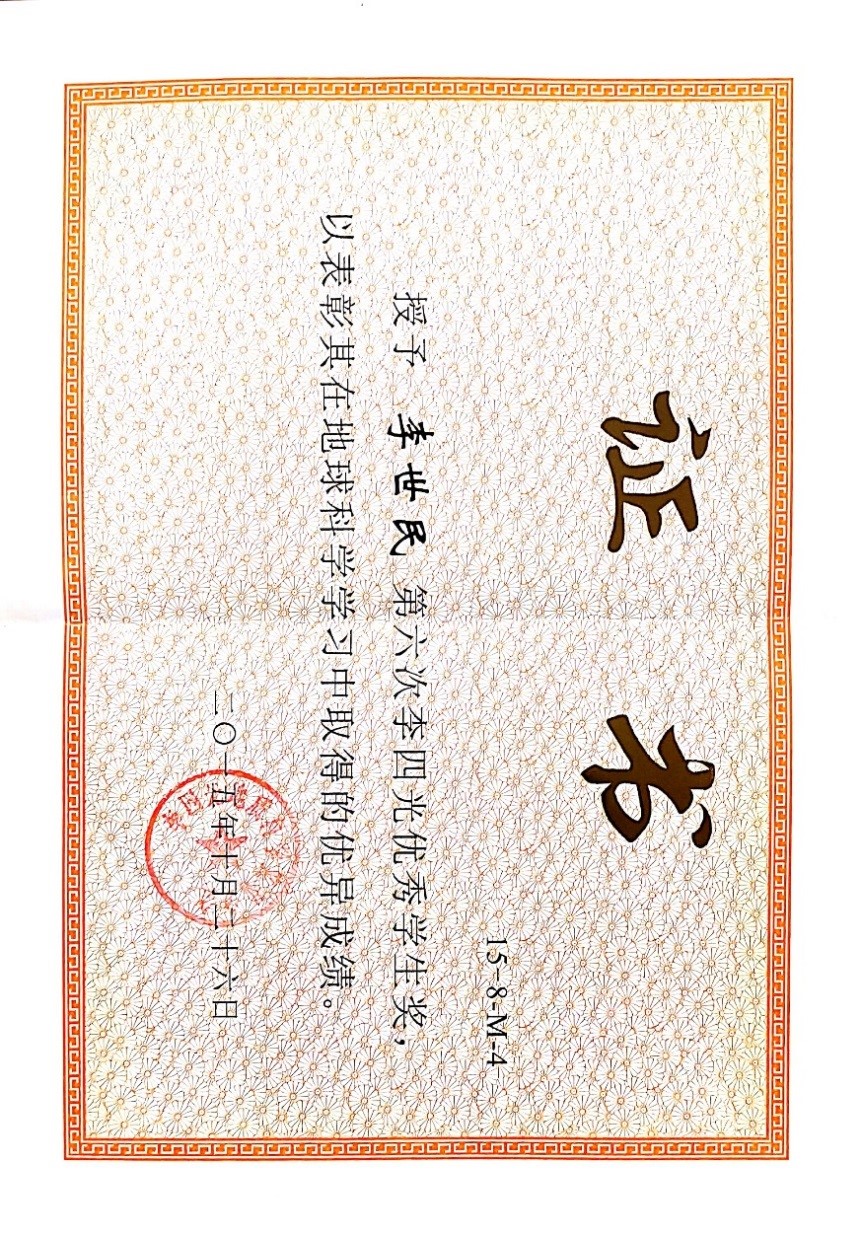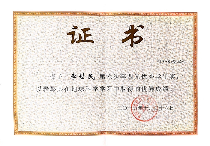 2015 李四光优秀学生奖-李世民 国家级 李四光优秀学生奖委员会