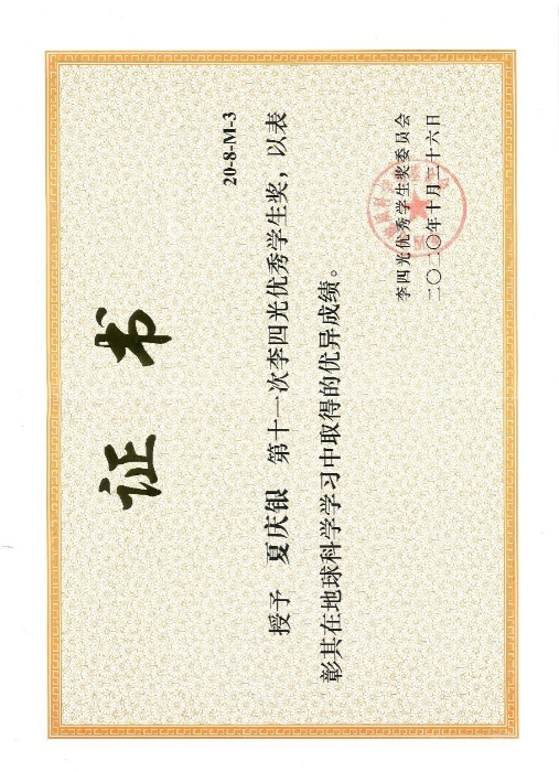 2020 李四光优秀学生奖-夏庆银 国家级 李四光优秀学生奖委员会