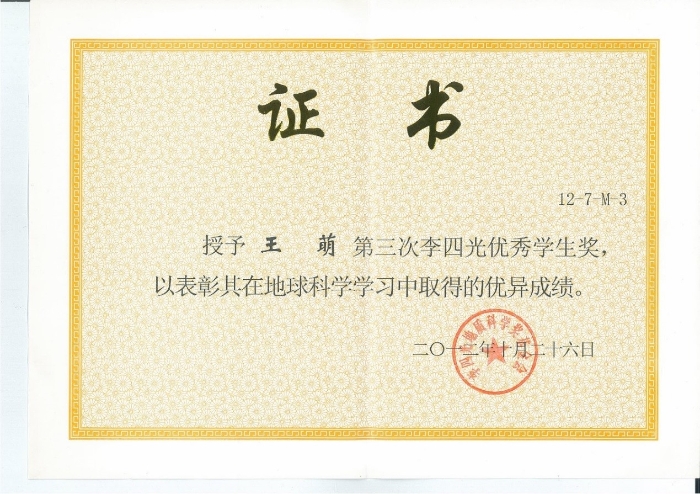 2012 李四光优秀学生奖-王萌 国家级 李四光优秀学生奖委员会