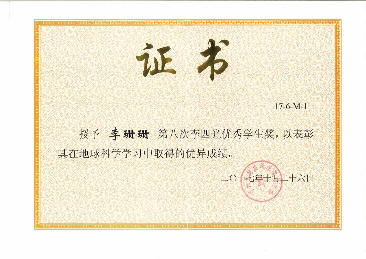 2017 李四光优秀学生奖-李珊珊 国家级 李四光优秀学生奖委员会