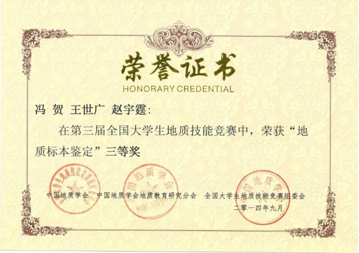 2014 冯贺,王世广,赵宇霆 第三届全国大学生地质技能竞赛 地质标本鉴定三等奖