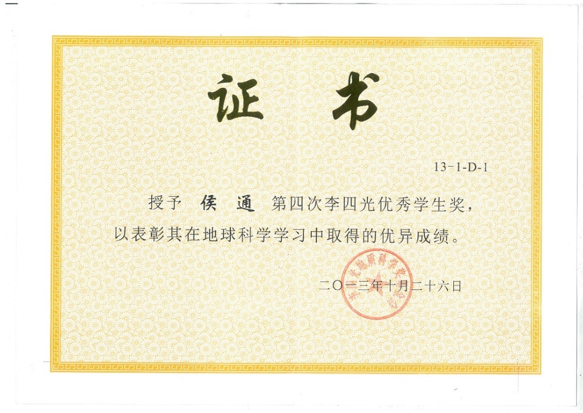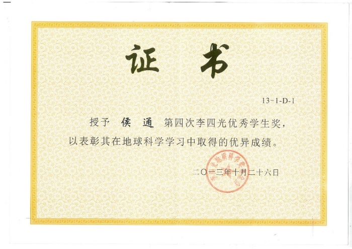 2013 李四光优秀学生奖-侯通 国家级 李四光优秀学生奖委员会