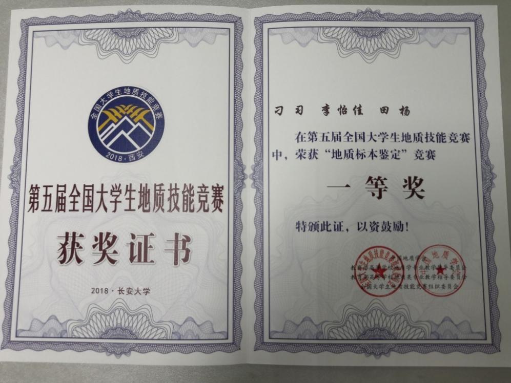 2018 刁习,李怡佳,田杨 第五届全国大学生地质技能竞赛 地质标本鉴定一等奖
