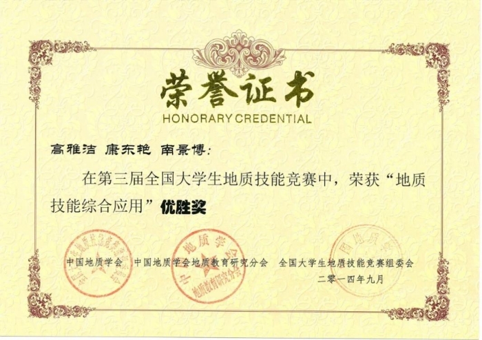2014 高雅洁,康东艳,南景博 第三届全国大学生地质技能竞赛 地质技能综合应用优胜奖