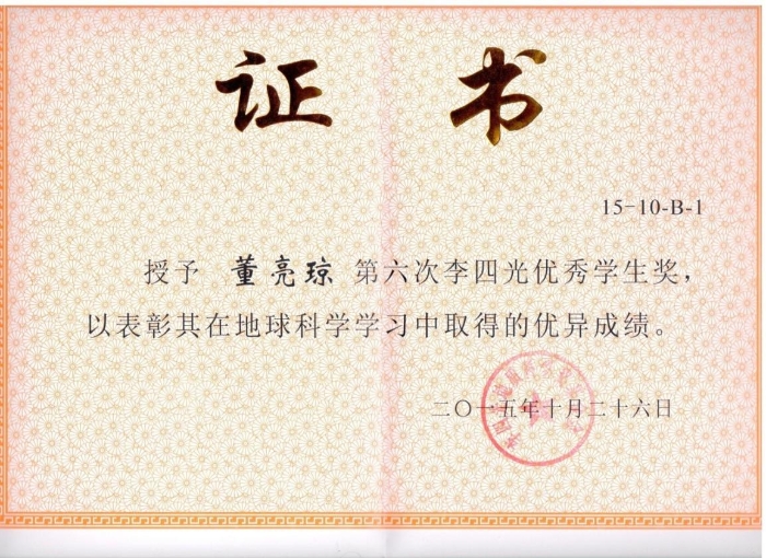 2015 李四光优秀学生奖-董亮琼 国家级 李四光优秀学生奖委员会